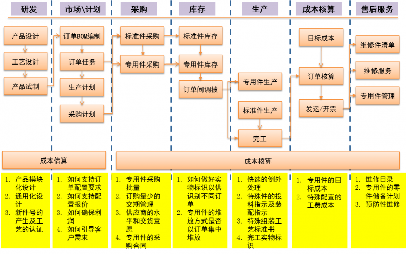 8.成本控制方面:实现按订单、产品的成本精细核算是管理提升的重点和难点,需要提供成本核算所需要的准确、及时、完整的料、工、费数据,建立科学、可行的核算模型。同时在成本核算实施过程中引入必须的业务流程管理标准。