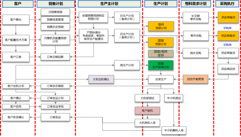 6.生产控制:订单-计划跟踪与控制能力较弱。主要存在两个方面的问题:一是生产作业计划不够准确,毛坯加工、零件加工与组装之间的计划衔接不够准确,计划颗粒度大;二是缺乏对执行现场信息的及时跟踪了解,造成交货周期的拖延;