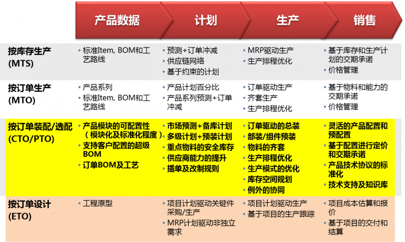 4.生产模式:多种生产模式共存,生产计划变动频繁。在生产计划管理组织环节上,有按订单设计、订单装配、订单制造和按库存预测备货等多种生产模式;
