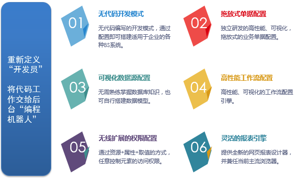 亿格的技术开发平台是一套独立开发的高性能、易使用、功能强大的业务配置平台,其核心功能包括应用管理、数据源管理、单据配置、报表制作、权限管理和工作流管理等。
